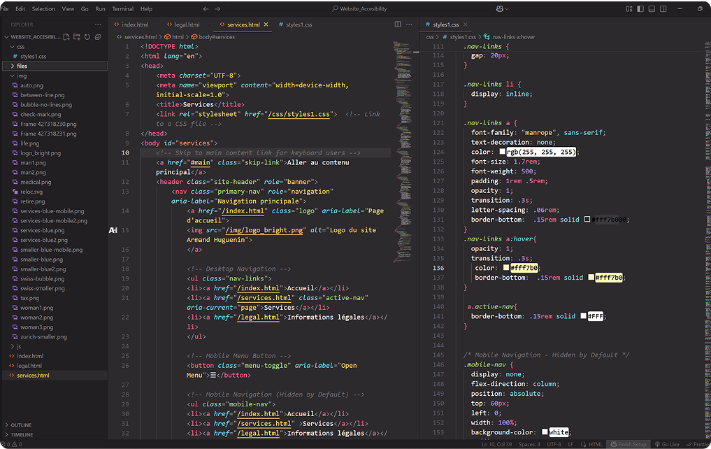 Au-delà de la conception, j'ai codé l'ensemble du site web en HTML et CSS. Cela m'a permis de garder un contrôle total sur la façon dont l'identité se traduisait dans le produit final. L'hébergement a été configuré pour offrir à Armand un site léger, facile à maintenir, qui se charge rapidement et qui a un aspect professionnel sur tous les appareils.