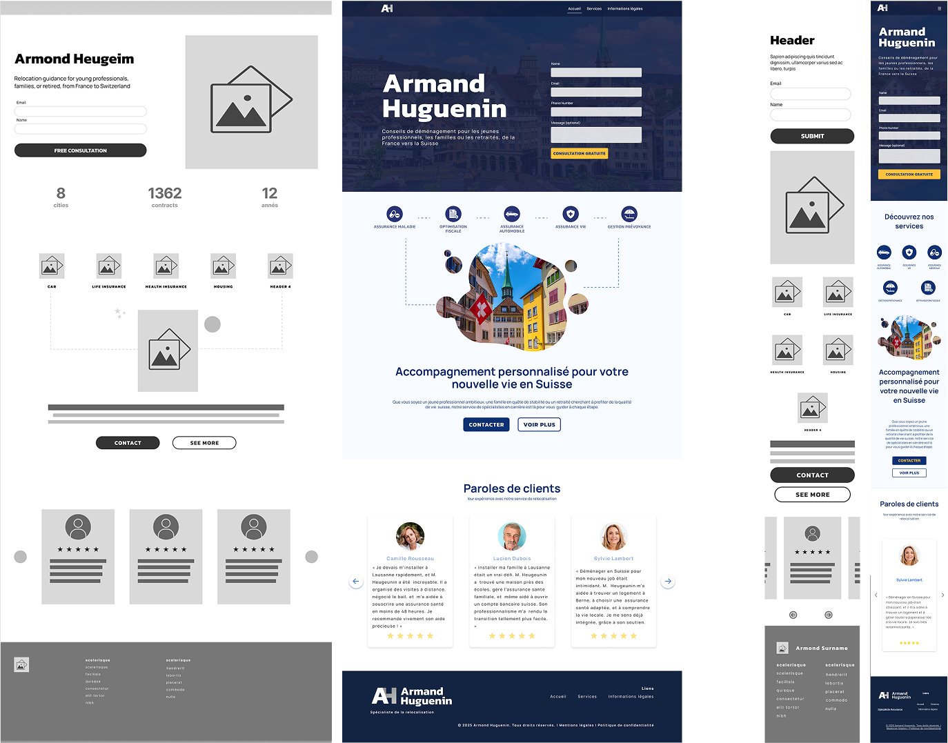 Ces trois personas représentent les principaux groupes de clients pour Huguenin Conseil : les retraités cherchant de la réassurance, les familles privilégiant la stabilité, et les jeunes professionnels recherchant l'efficacité. Leurs besoins ont mis en évidence trois priorités : la confiance, la clarté et l'accessibilité - qui ont directement façonné l'identité de marque et orienté la conception du site web vers une expérience professionnelle, accessible et facile à naviguer.
